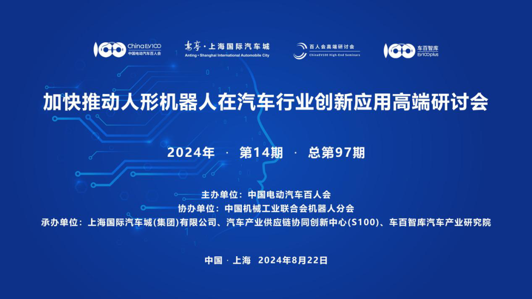8月22日,由中国电动汽车百人会主办,中国机械工业联合会机器人分会协办,上海国际汽车城(集团)有限公司、汽车产业供应链协同创新中心(S100)、车百智库汽车产业乐玩lewin共同承办的“加快推动人形机器人在汽车行业创新应用”高端研讨会,暨百人会2024年第14期(总第97期)高端研讨会,在上海嘉定顺利召开。研讨会由百人会副秘书长师建华主持。